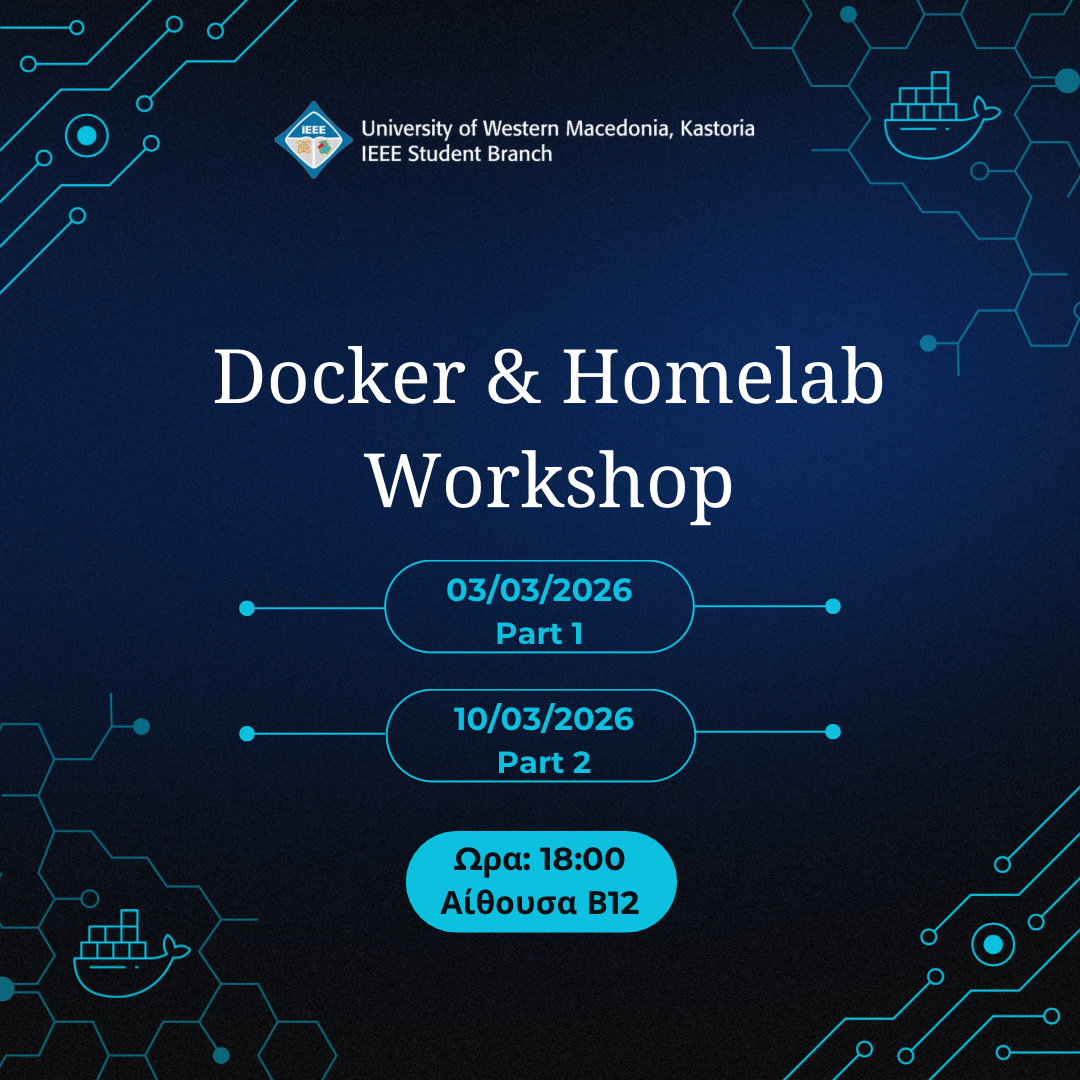 Το IEEE Student Branch University of Western Macedonia (Kastoria) προσκαλεί τη φοιτητική κοινότητα στο επερχόμενο Workshop με τίτλο “Docker & Home Lab”.